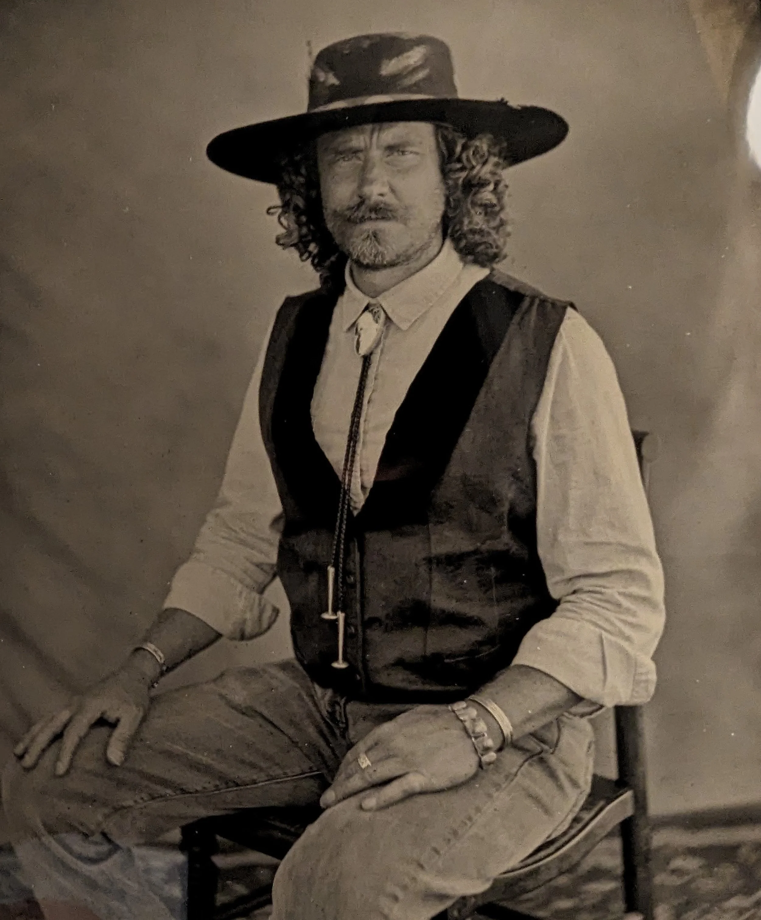 A striking stone accents this bolo handmade by Jon Kell. White Buffalo Turquoise with braided black leather ties and sterling clasp and accents to adjust the stone. Jon’s attention to detail is evident with the stamping detail on the reverse. 21” length.