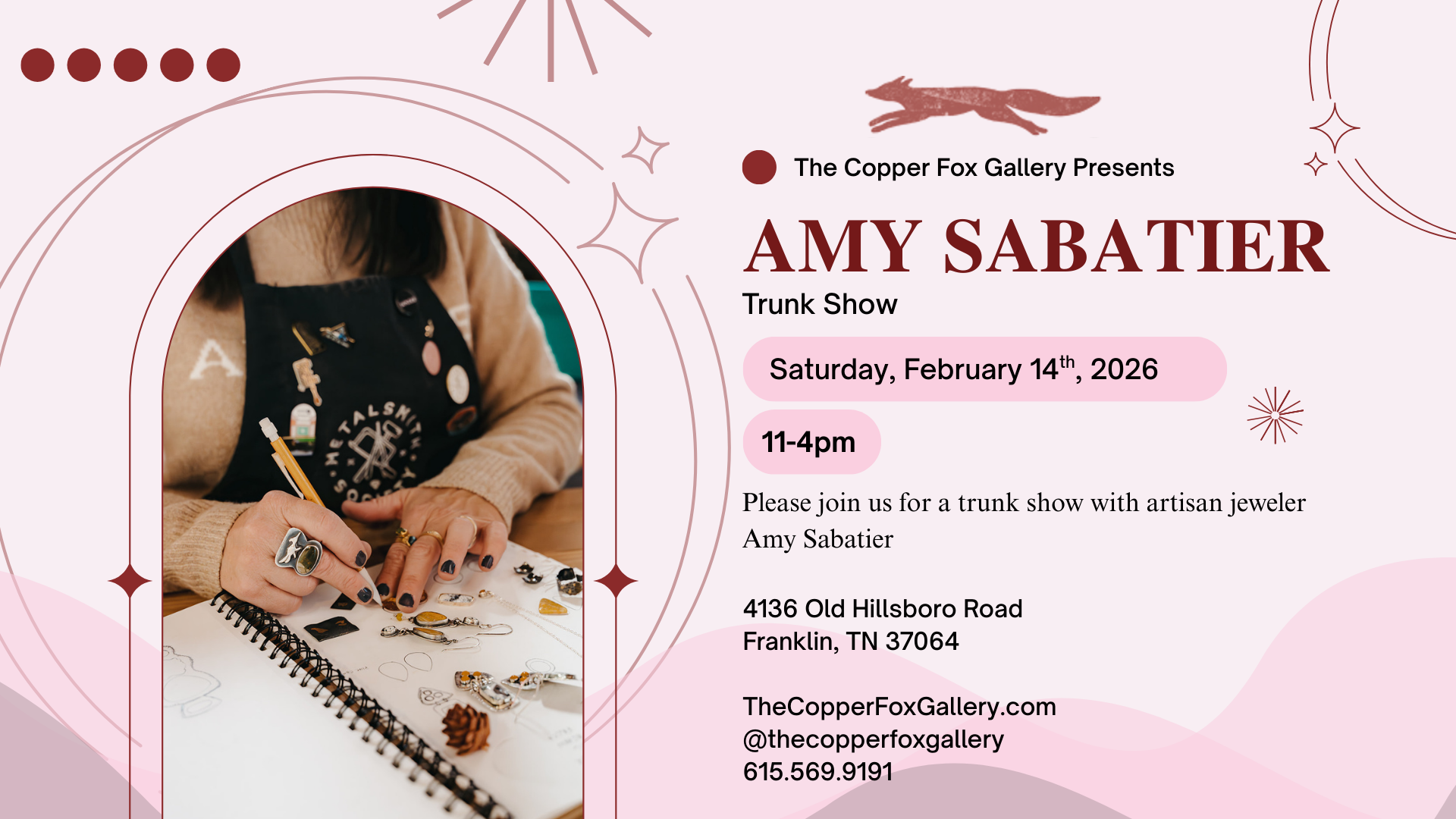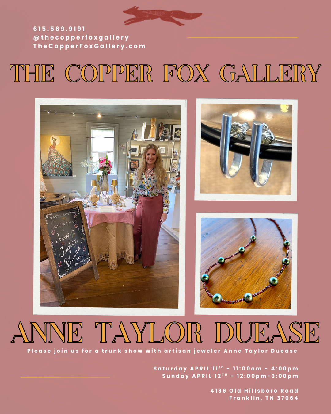 Join artisan and jeweler Anne Taylor Duease for a trunk show at the Copper Fox Gallery 11-3pm