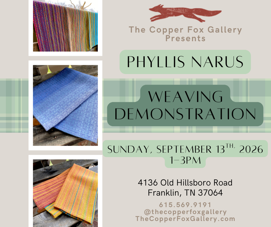 Join weaver and textile artist Phyllis Narus for a demonstration in weaving on the loom at the Copper Fox Gallery.