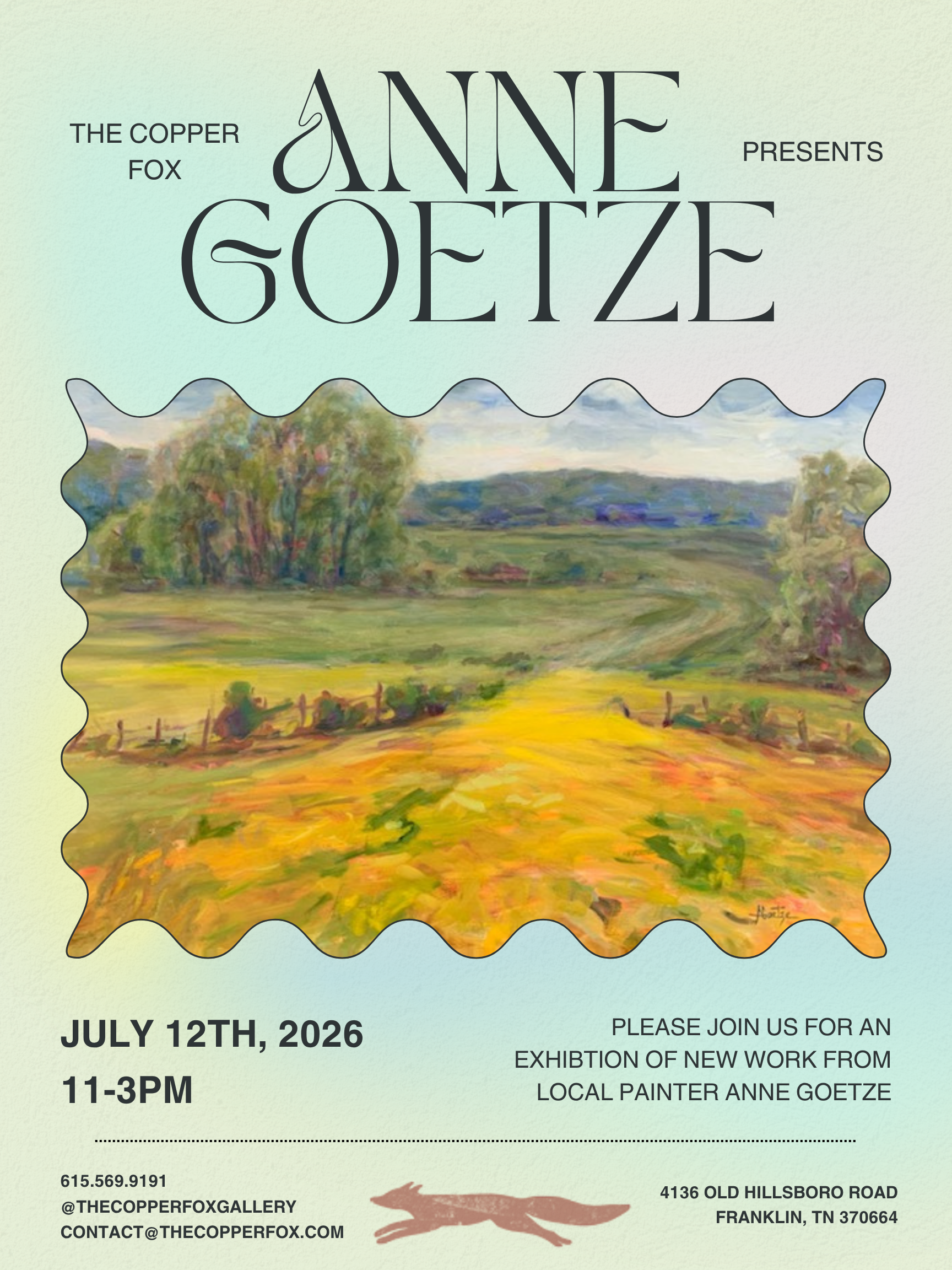 Back to All Events Anne Goetze Painting Exhibition Sunday, July 12, 2026 12:00 PM 3:00 PM The Copper Fox Gallery 4136 Old Hillsboro Road Franklin, TN, 37064 United States (map) Google Calendar ICS