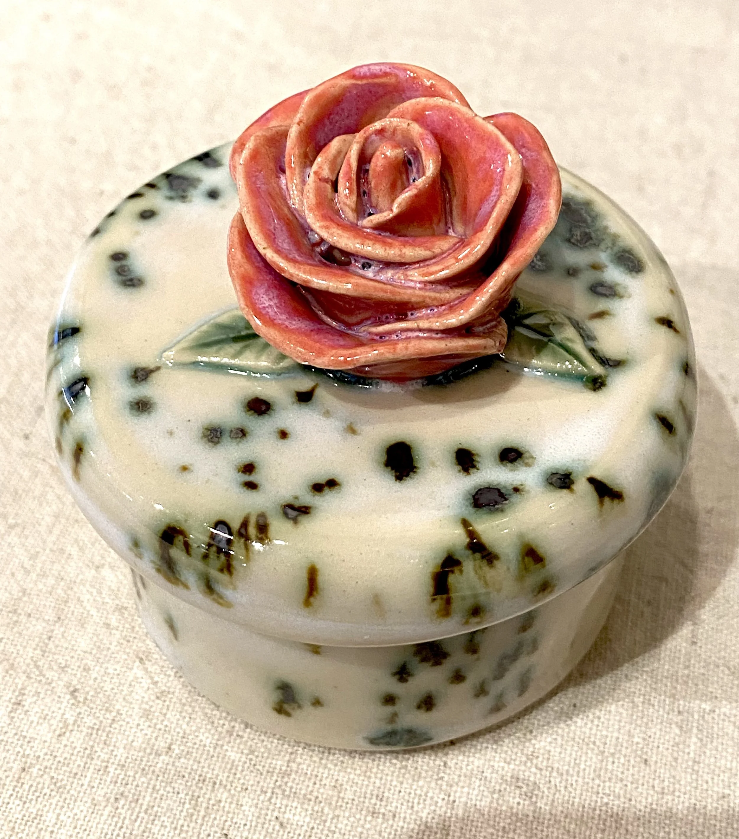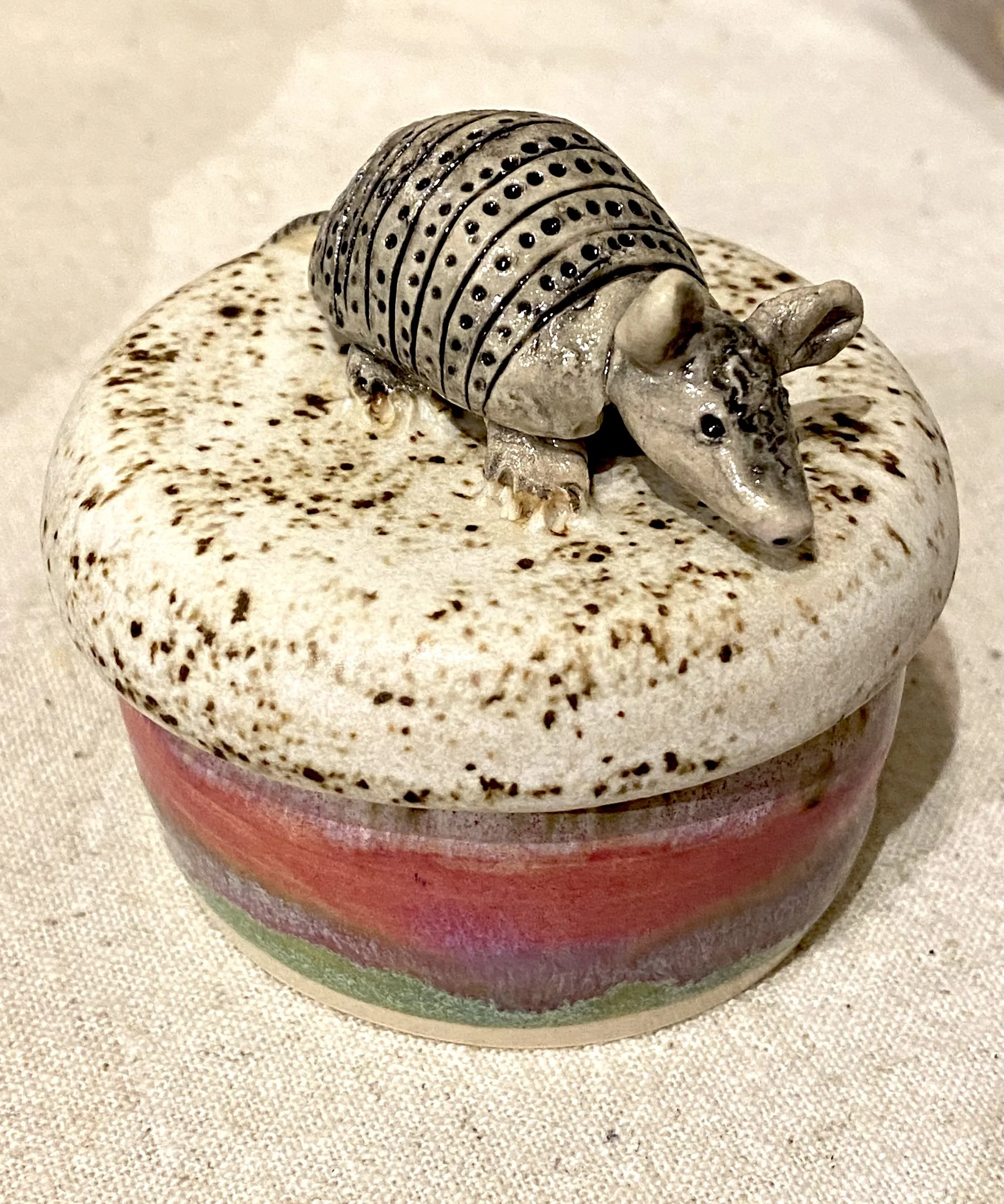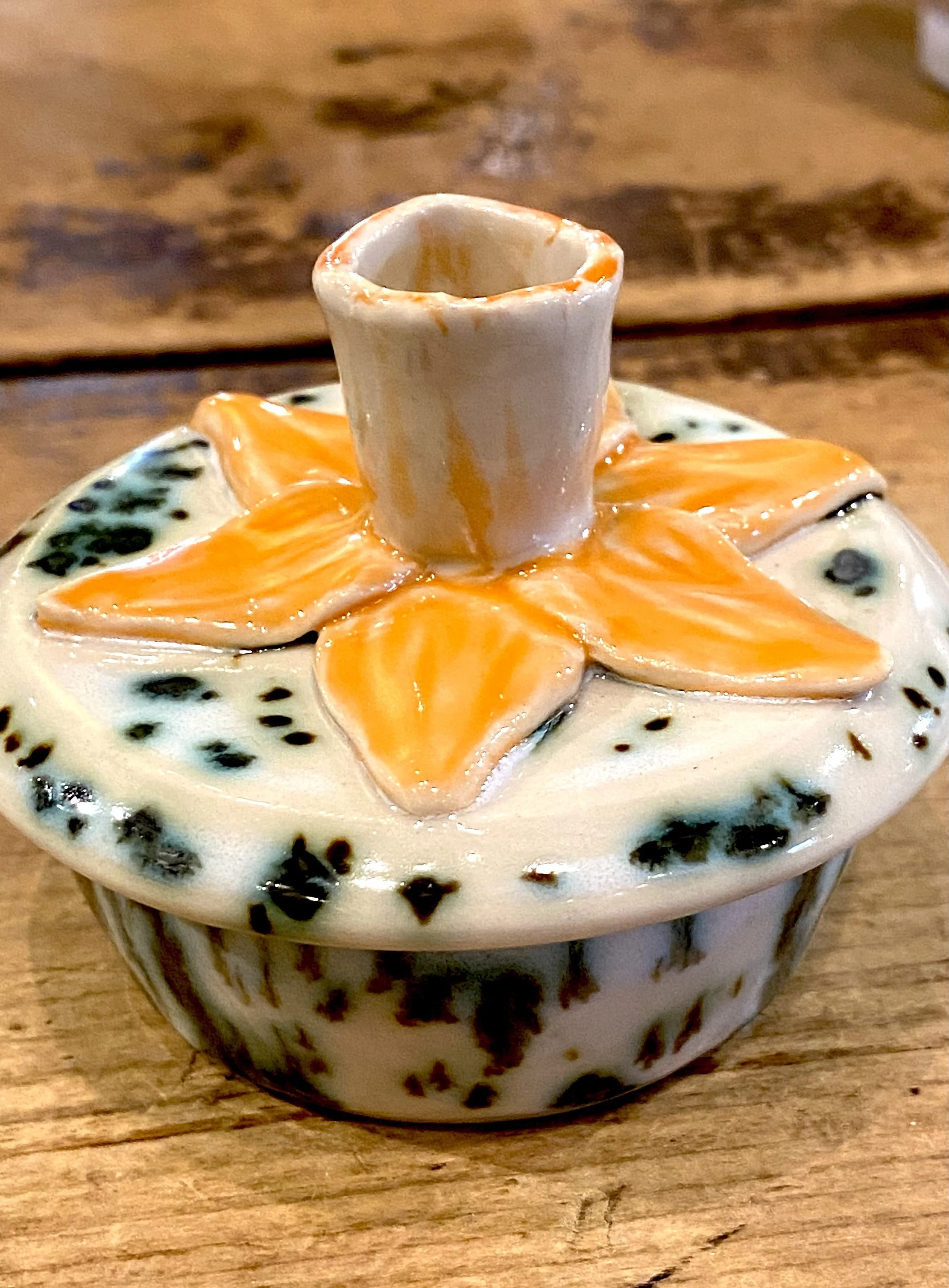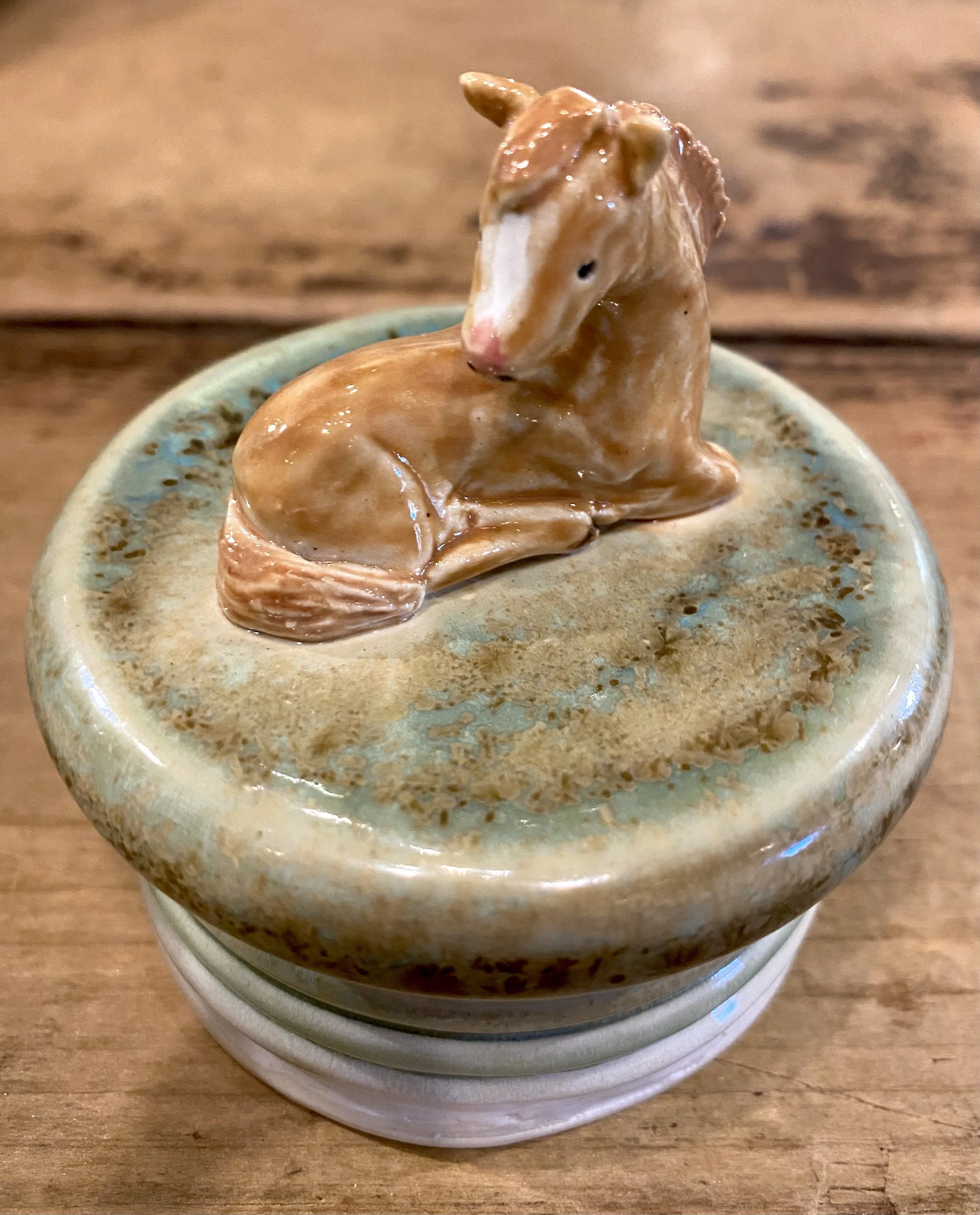 Adorable handcrafted horse sculpture from clay artist Donn Rizzo. Speckled glaze. 4×4×10”